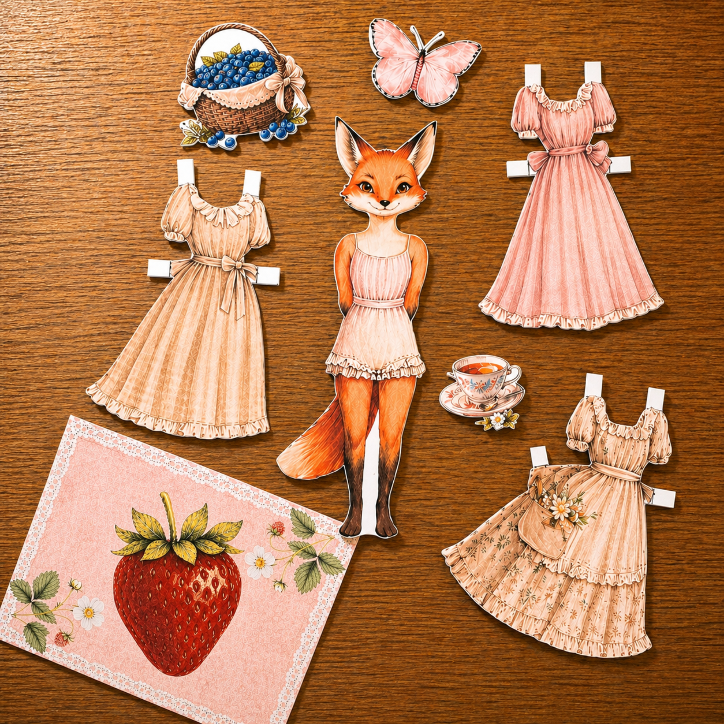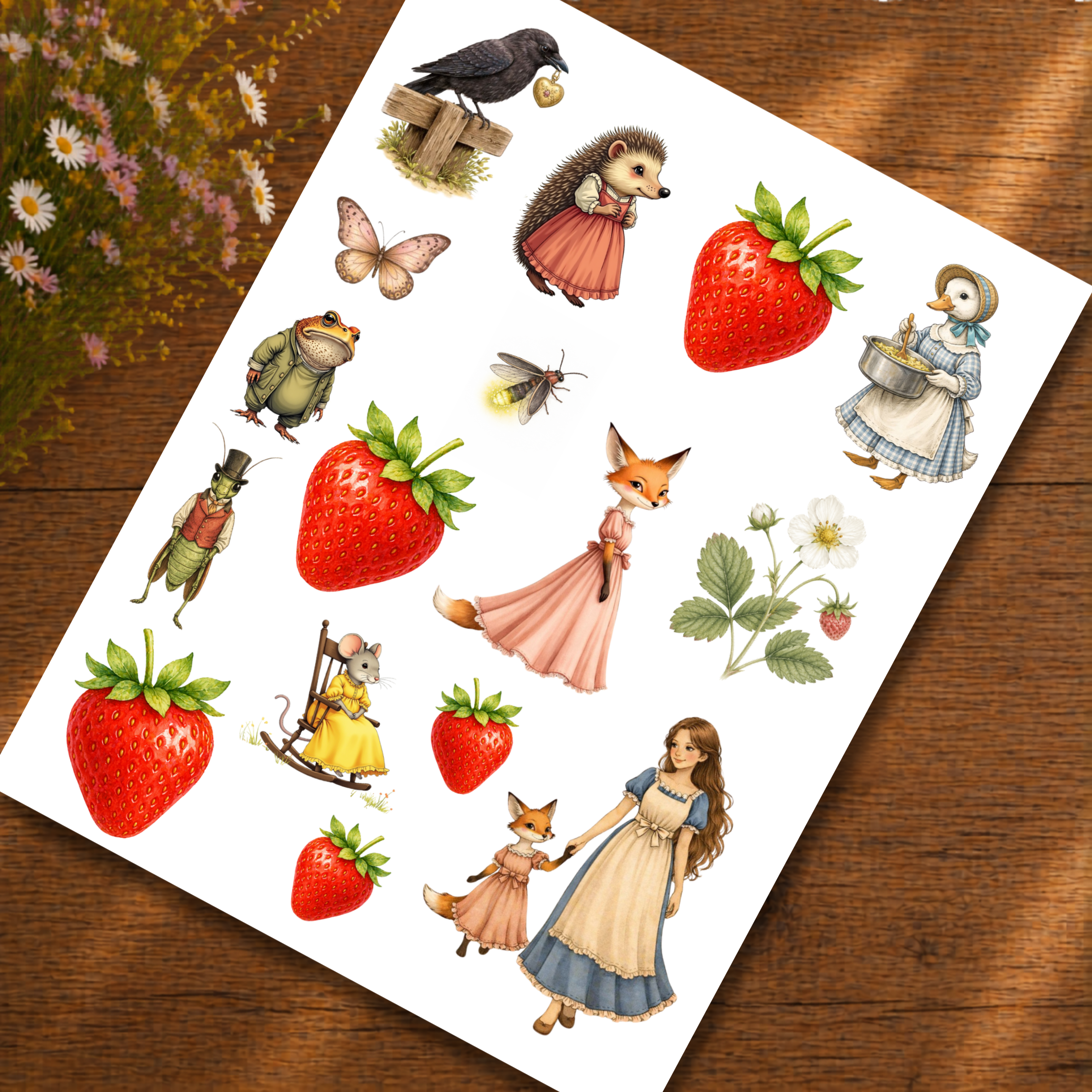 Every piece coordinates in a warm woodland storybook style inspired by cottage gardens, strawberries, forest creatures, and vintage paper ephemera.